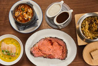 お店の看板メニューであるプライムリブは、塩昆布と麹のクラストが香ばしく、ホースラディッシュクリームとシングルモルトを使ったオージュ(肉汁ソース)とともに提供される逸品。その他にも、日替わりの和牛、1オンス7ドルの45日熟成リブアイ、1オンス6ドルの45日熟成トマホークステーキなど、肉好きにはたまらないメニューが揃っています。